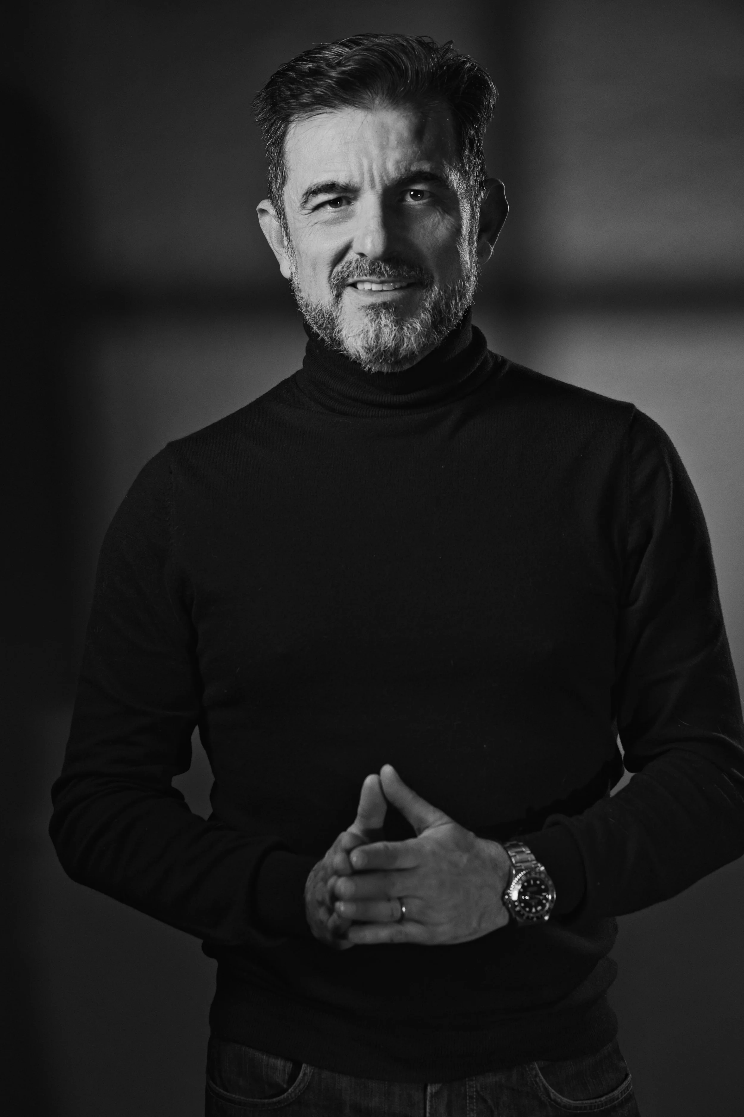 Retrato en blanco y negro de un hombre con barba, viste un suéter negro de cuello alto, sonríe ligeramente y tiene las manos juntas en posición de oración.